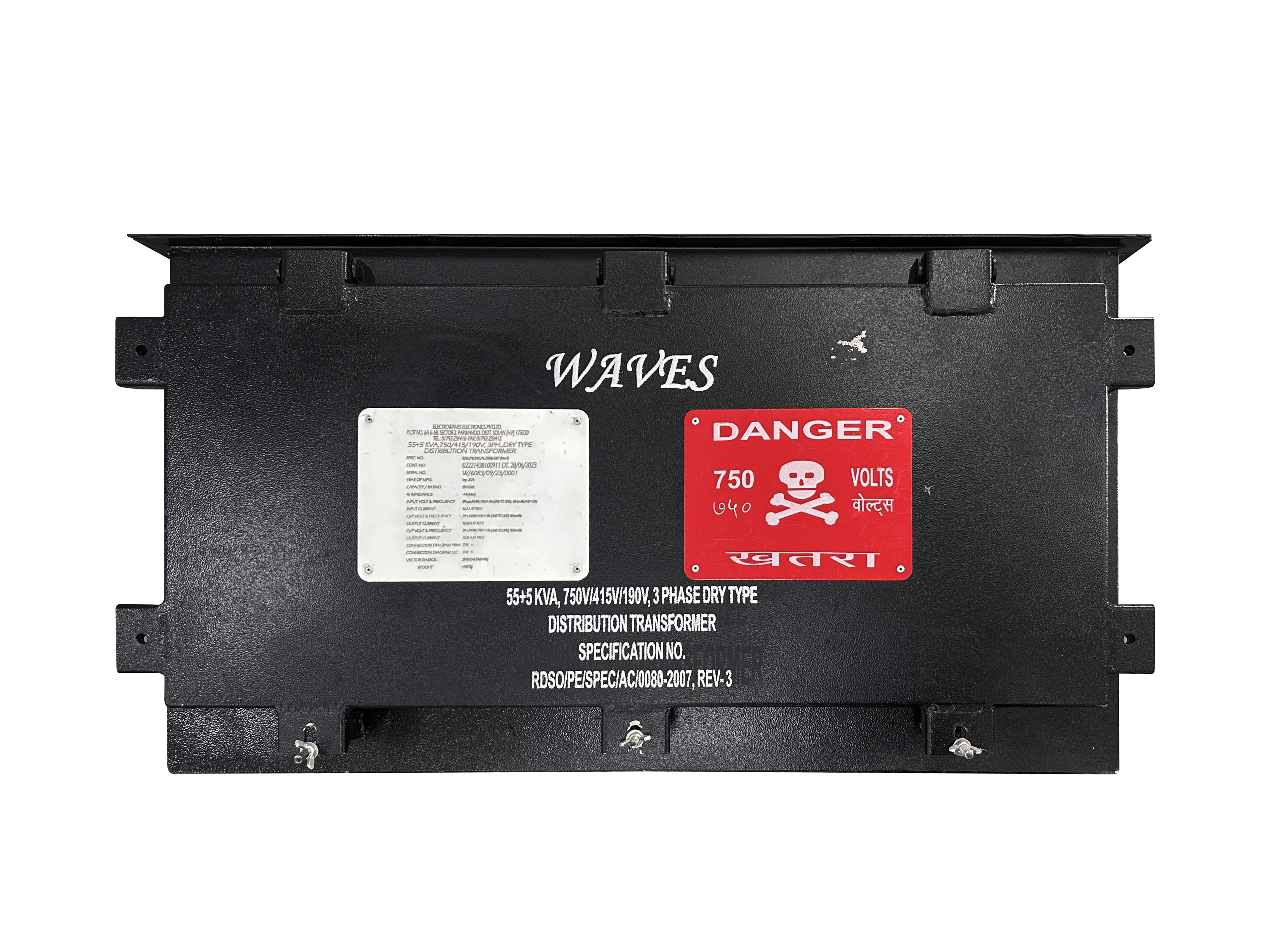 55+5 kVA, 3-phase, dry type, natural or air-cooled distribution transformer engineered for railway coach for LHB Type AC EOG coaches/ power car/ pantry car/ power car of Indian Railways.